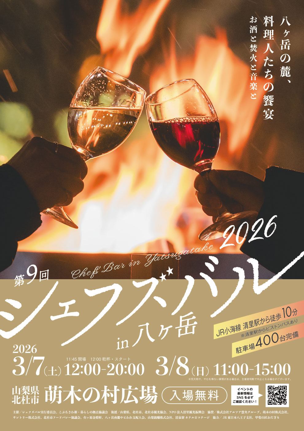 真冬の八ヶ岳の空の下、北杜を代表する飲食店のシェフたちが、八ヶ岳のゆたかな食材をふんだんに使ったお料理を振る舞います。焚き火を囲みながら、シェフ渾身の料理と八ヶ岳のお酒、山梨由来のミュージシャンたちのステージを楽しむ北杜ならではの冬を美味しく楽しく満喫するイベントです。 日時/2026年3月7日(土)11:45~20:00 ※11:45開場、12:00乾杯・スタート 3月8日(日)11:00~15:00 会場/萌木の村広場 --> 公式サイト https://www.yatsugatake-chefsbar.com/ |