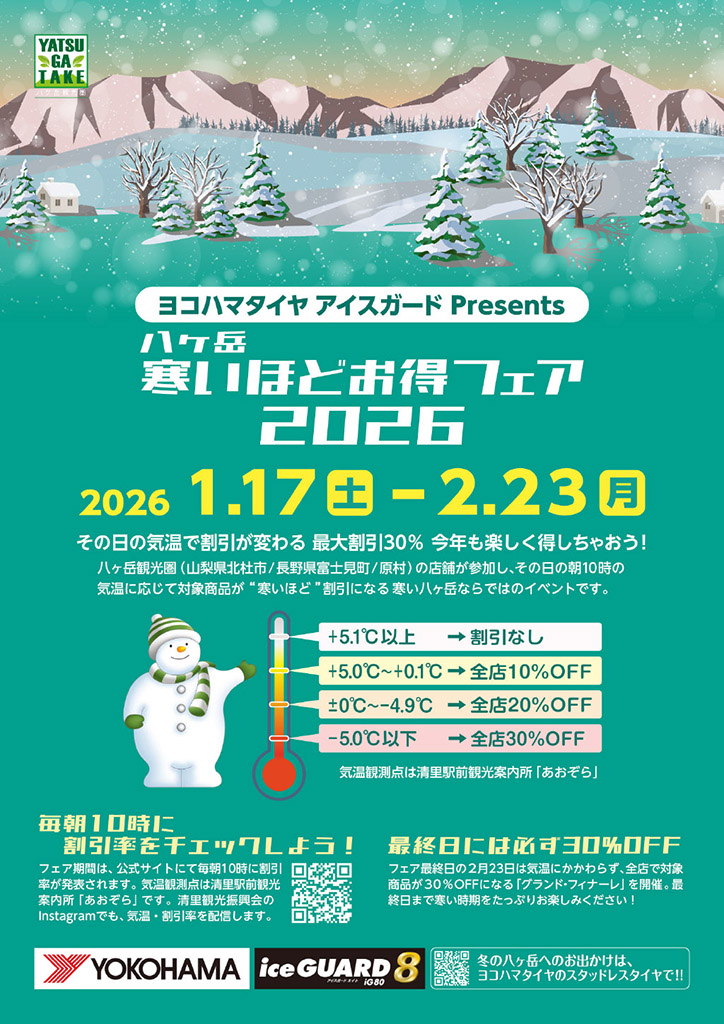 八ヶ岳観光圏(山梨県北杜市/長野県富士見町/原村)の店舗が参加し、その日の朝10時の気温に応じて対象商品が“「寒いほど”割引になる」寒い八ヶ岳ならではのイベントです。2026年1月17日(土)~2026年2月23日(月)までの38日間にわたって開催します。なお最終日は必ず30%OFFのグランドフィナーレ! フェア最終日の2月23日は気温にかかわらず全店対象商品が30%オフになる「グランド・フィナーレ」を開催。最終日まで寒い時期をたっぷり楽しんでいただけます! 【グループ施設の対象商品(価格は全て税込)】 ・オーベルジュ清里 レストラン ル マリアージュ/① 寒得スペシャルランチ(通常価格:3,800円)、② 寒得スペシャルディナー (通常価格:Aコース 9,500円、Bコース 12,000円 ※サービス料10%別途) ・ハットウォールデン レストラン ネスト/チーズフォンデュセット(食後のお茶/プチデザート付き)(通常価格:3,500円)※1日20食限定 ・ハットウォールデン Bar Perch/① Perchのジントニック(通常価格:950円)、② 対象のウイスキー(通常価格:1,200円〜) ・オールドエイジ /① ビーフシチュー(通常価格:3,630円)、② スパイシーチキンカレー ローストチキン添え(通常価格:2,970円) 公式サイト https://samutoku.com/ |