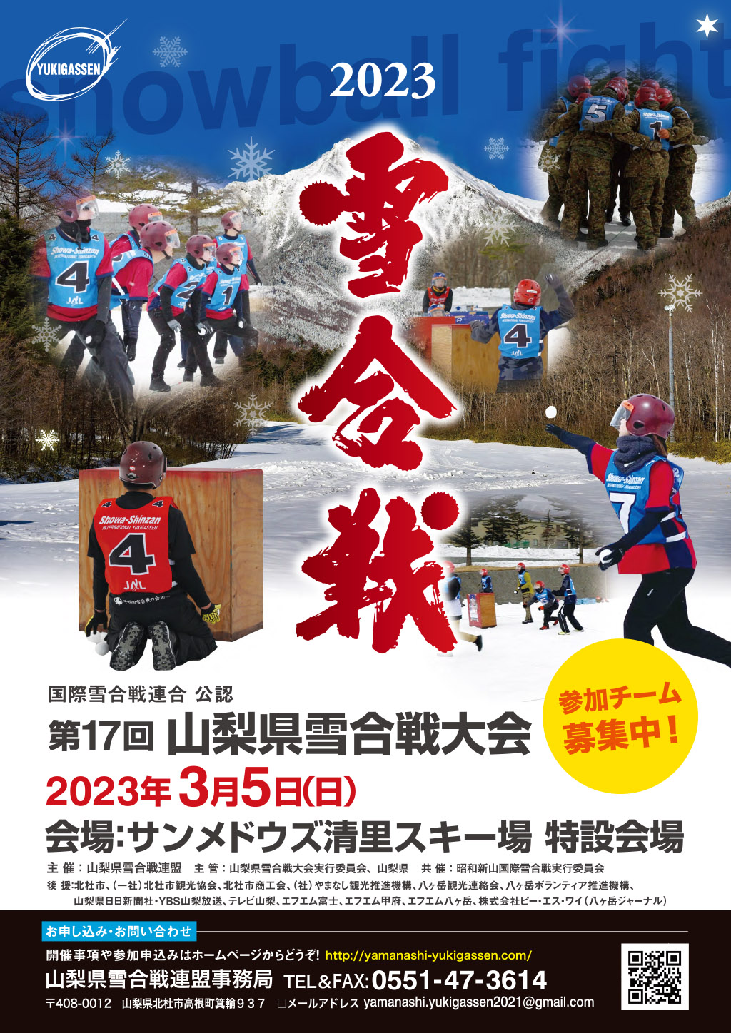サンメドウズ清里スキー場のゲレンデをバックに繰り広げられる熱い雪上スポーツです。全国から集まった精鋭チームが優勝旗をかけて戦います。ぜひ会場でその迫力を感じていただき、参加されるチームに声援をお願いします。(※チラシ画像は過去のものです)開催日/2026年3月8日(日) 会 場/サンメドウズ清里スキー場 特設会場 公式サイト https://www.yamanashi-yukigassen.com/ |