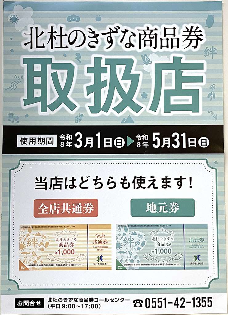 北杜市が発行する「北杜のきずな商品券」が2026年3月1日〜5月31日の期間中、取扱店のポスターが掲示されている参加施設にてご利用いただけます。プチホテルグループ加盟施設でもご宿泊やお食事にご利用いただくことができます。 ぜひこの機会に、商品券をご利用いただきお得に清里の休日をお楽しみ下さい! ※ご宿泊のご利用には事前のご予約が必要です。 ※施設により期間中でもご利用除外日やクーポン対象外商品がありますので、別途ご確認くださいませ。 |